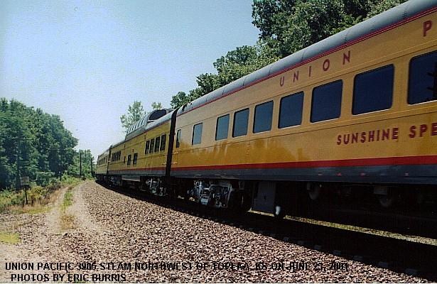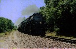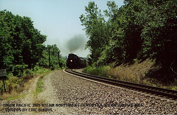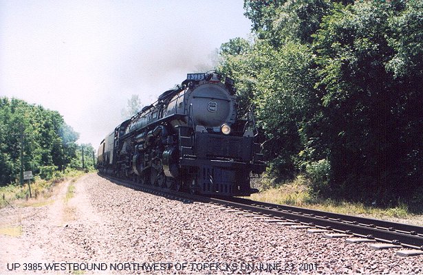 Union Pacific 3985 steam locomotive heads westbound several miles northwest of Topeka, Ks on the UP Kansas City subdivision on June 23, 2001. It is headed to Marysville for an overnight stay on its way back to North Platte, Nebraska.