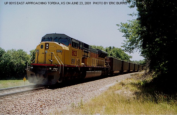 UP 8015 east approaches Topeka with coal loads and a remotely controlled(DPU) locomotive pushing from the rear. photos by Eric Burris
