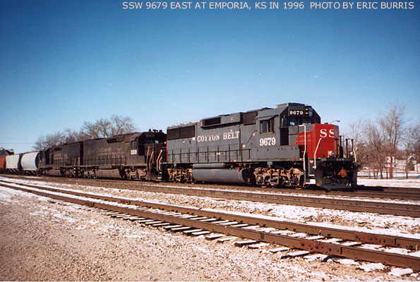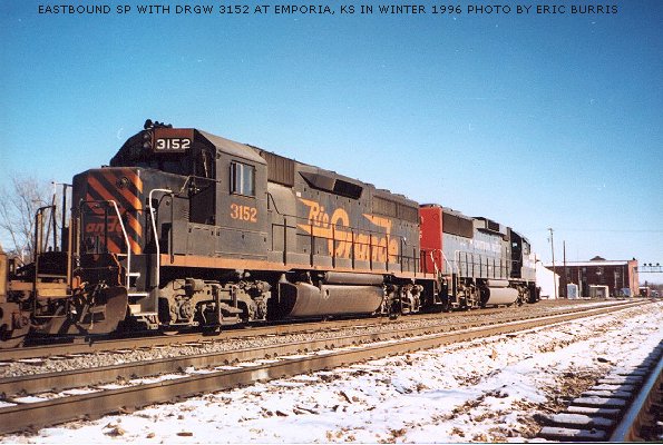 St. Louis Southwestern 9679 east waits for a lineup at Emporia during 1996. 9679 is a GP60. Shortly later another SP train stops at the signal with Rio Grande 3152. Photos by Eric Burris.