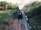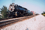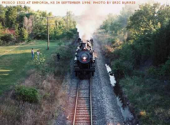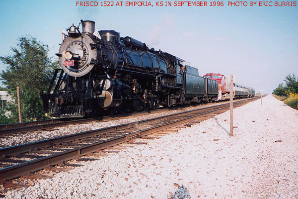 Frisco 1522 stops at NR Junction at Emporia to throw the switch to the Topeka subdivision to go to Topeka Railroad Days. Frisco 1522 accelerates up to speed as it enters the Topeka Sub. Frisco made this appearance in September 1996. Photos by Eric Burris.