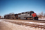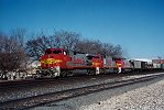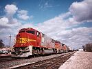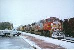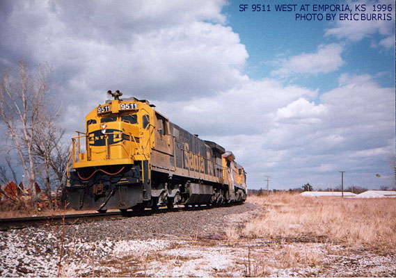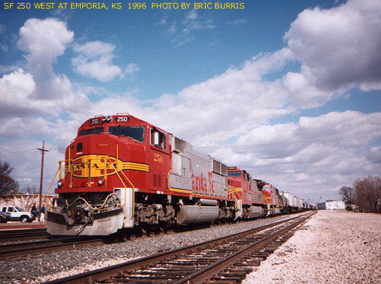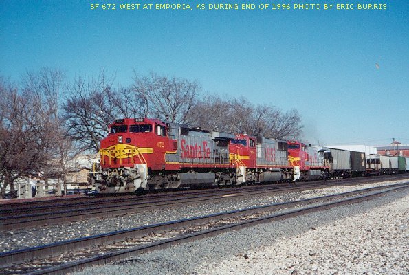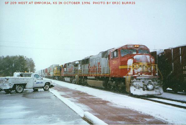 During October 1996 Santa Fe 209 west blast through the snow, called the "October Surprise". Santa Fe 672 west passes milepost 112 at Emporia during late 1996. 672 is a Dash 9-44CW.