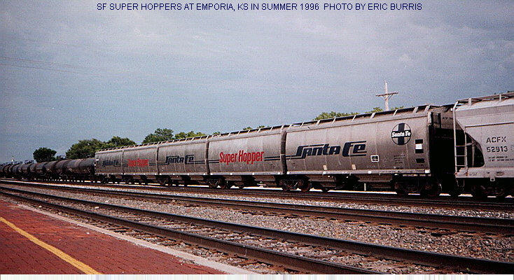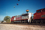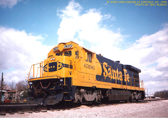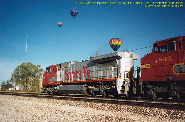 (LEFT) Santa Fe 928 west passes NR Junction while the annual balloon race takes place. Normally the wind doesn't bring the balloons near the tracks. SF 928 is a Dash 8-40CW. This photo is from October 1995. (MIDDLE) Santa Fe 250 west passes the Emporia Depot during March 1996. 250 is a SD70M built by EMD. (RIGHT) Santa Fe 6396 was the yard engine that week at Emporia, Ks. 6396 is a B23-7. Photos by Eric Burris.