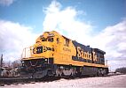 (LEFT) Santa Fe 9511 pulls the loaded westbound Redrock coal train off the Topeka Sub at NR Junction. 9511 and many others has been retired as BNSF received new engines. (RIGHT) Cimmeron Valley Railway loaned two units out to Santa Fe during late March 1996. CVR is a small shortline railroad from western Kansas and part of Oklahoma. Photos by Eric Burris.