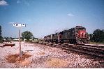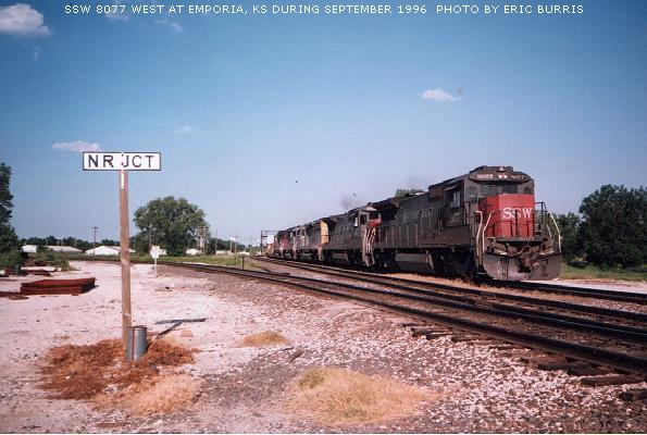 SSW 8077 west rumbles past NR Junction at Emporia during July 1996. Santa Fe Superhoppers are being taken to the Bunge Elevator by the yard engine. There is only three sets of Superhoppers on the former Santa Fe.