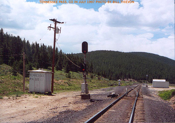 DRGW GP40 3085 heads south on the Montrose branch, just south of Delta Colorado (running long hood forward. The branch used to run to Ouray, and actually was part of the Rio Grande's original mainline (narrow guage) over Marshall Pass (it turned east at Montrose and headed to Gunnison). Just a local. The summit of Tennesse Pass, on the east side of the summit looking (track wise) toward Pueblo. The summit tunnel is directly behind me. Photos and text by Bill Thievon.