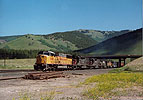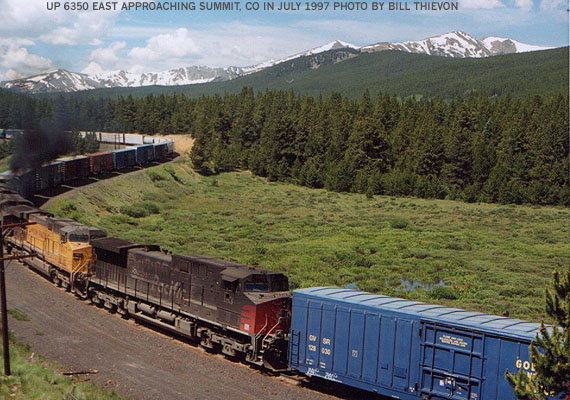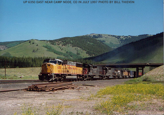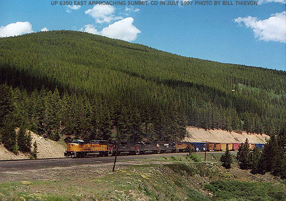 The first three pictures are of an eastbound UP merchandise coming up the west side of Tennessee Pass, from Minturn up to the summit. In charge is UP SD60M 6350, SP SD40T-2 8282 and 8290 (Tunnel Motors), NS SD60 6576, and UP SD60M 6219. Helpers added at Minturn and cut in about 3/4 of the way back are SP 222 371 UP 7017 and SP 183, all AC4400CW (the UP is a AC4400CW(U) meaning it is upgradable). (MIDDLE) This is taken between Camp Hale and the summit 2. This is the helpers coming around the "S" curves just west of the summit 3) (RIGHT)The train coming under US24 at Camp Hale, the WWII training group for troops of the 10th Mountain Division (1942-1944). The 10th Mtn was the only specialized mountain/ski soliders in the history of the US Army. Photos and text by Bill Thievon.