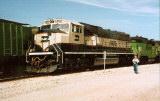 BN 9478 (an SD70MAC) and a GP9 move around the east end of the Emporia Yard in July 1997. The Green & Creme BNs (SD70MACs)don't make very many appearances around the Emporia sub. They are used mostly for coal trains on the Bn lines. The "MAC" means modern cab and alternating current traction motors. AC traction motors work perfectly for hauling heavy coal trains without burning up the traction motors. The traction motors are on the wheels on the locomotive trucks. Photo by Eric Burris.