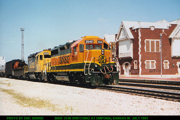 BNSF 2540 was the first SF engine to be painted Pumpkin colors and is a GP35. 2540 was the switch engine at the Emporia Yard for a whole month in July 1997. She sure was fun to look at an ride. One of the guys I know let me ride it from the Bunge Elevator all the to the yard. I got to adjust the throttle and blow the horn. Until the engineer took over to slow the train down to stop in the yard. Photo by Eric Burris.