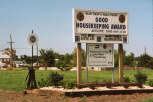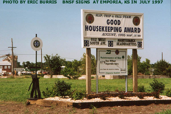 (LEFT) Here's the BNSF signs as seen from South Avenue in July 1997. The top one is a Santa Fe Goodhousekeeping award. The bottom one is a BN-SF injury free award. The switch stand on the left has a BNSF logo on it.