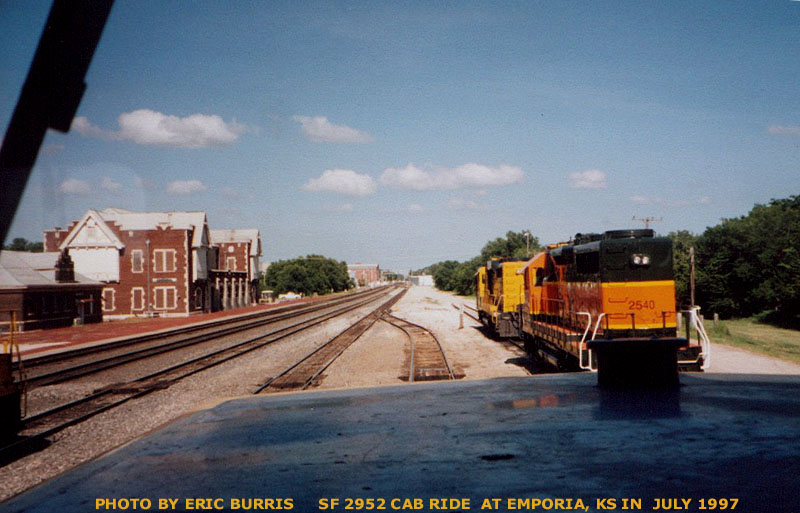 My friend and I are riding Santa Fe 2952 (a GP35) at the Emporia Yard in July 1997. The BNSF 2540 "Pumpkin" is to our right in front of us. The Emporia depot is to our left. We had an hour long cab ride in the yard. It was fun!! Photo by Eric Burris.