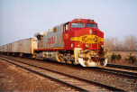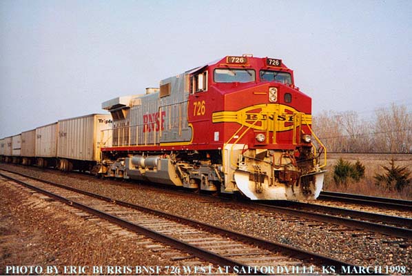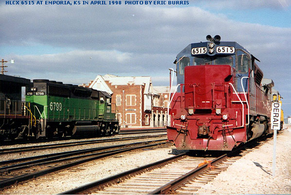 (LEFT) HLCX 6515 sits on the locomotive track at the east end of the yard at Emporia, Ks. during April of 1998. In the background an eastbound is seen working in the yard and is almost ready for a lineup to leave town. (RIGHT) During April 5th, 1998 BNSF 726 pulls the westbound Roadrailer train past Saffordville, KS after waiting on some other trains. 726 is a Dash 9-44CW. The roadrailers come from Kansas City and go to Fort Worth, Texas.
