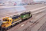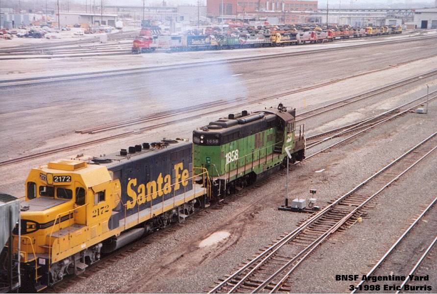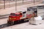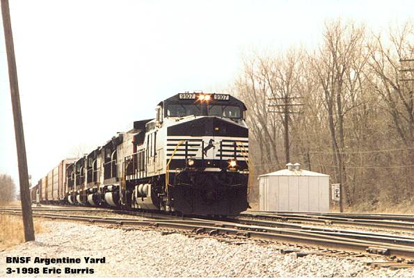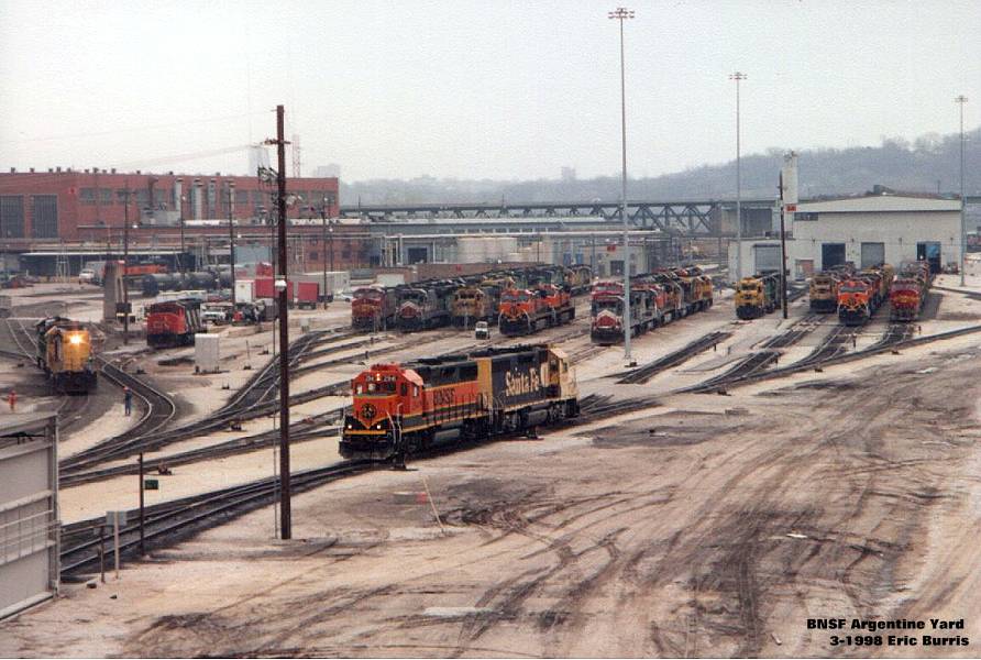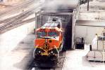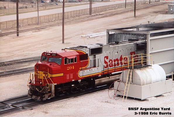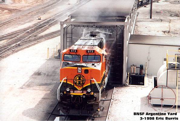 (LEFT) Santa Fe 204 eases through the washracks at the Argentine Yard Shops. A BNSF transfer job switches cars then head out of the yard. Two locomotives moves about in the engine facilities. (RIGHT) BNSF 973 and others goes through the wash racks.