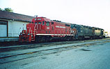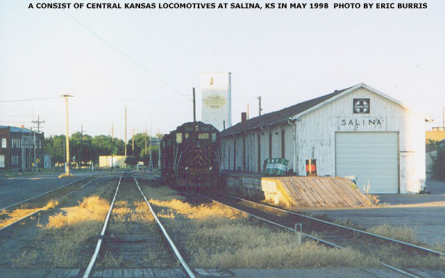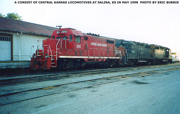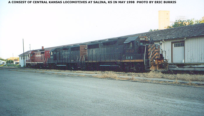 A locomotive consist used by Central Kansas Railway sits on their branchline at Salina, Ks at the old Santa Fe freight house. This branchline was once a Santa Fe branch that was sold off to CKR. The locomotives are: GWR 3042 GP35 (ex-Rio Grande), SP 6619 GP35, and CKR 2243 GP7. These photos are from May 1998 by Eric Burris.