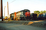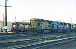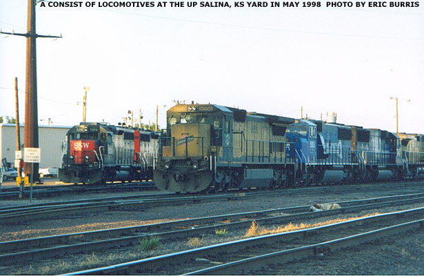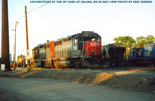 At the Union Pacific yard at Salina sits a variety of locomotives from many railroads. Since the former SP trains is the majority of the traffic here, some SP power is here as well as CNW and the Conrail units that are being leased by UP. There was some UP power further down the tracks. Salina has a neat UP depot and I'm looking at shooting more trains here. When I was at Salina in May 1998, no trains went by. Maybe I'll catch the happy hour next time. Photos by Eric Burris.