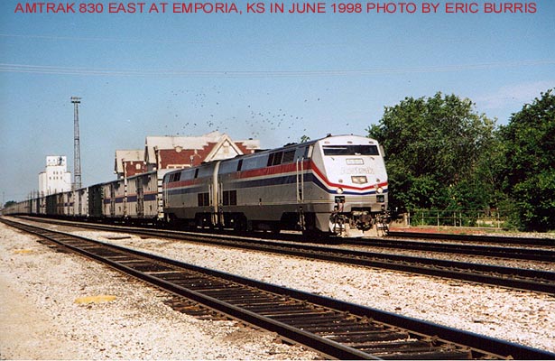 BNSF 1087 east passes the Emporia depot at 10:00a.m. in the morining during June 1998. BNSF 1000 west passes Fremont Park in the middle of Emporia, KS. on a late summer day in June 1998. Photos by Eric Burris.