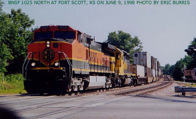 BNSF 1025 north passes through Fort Scott Kansas during a June afternoon in 1998. A short while later BN 5039 south rumbles past the yard office. BN 5039 is a C30-7 and the BNSF 1025 is a Dash 9-44CW. Photos by Eric Burris
