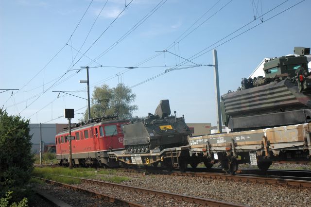 Panzerfahrzeuge. Deswegen gibt es ab und zu Militärzüge,