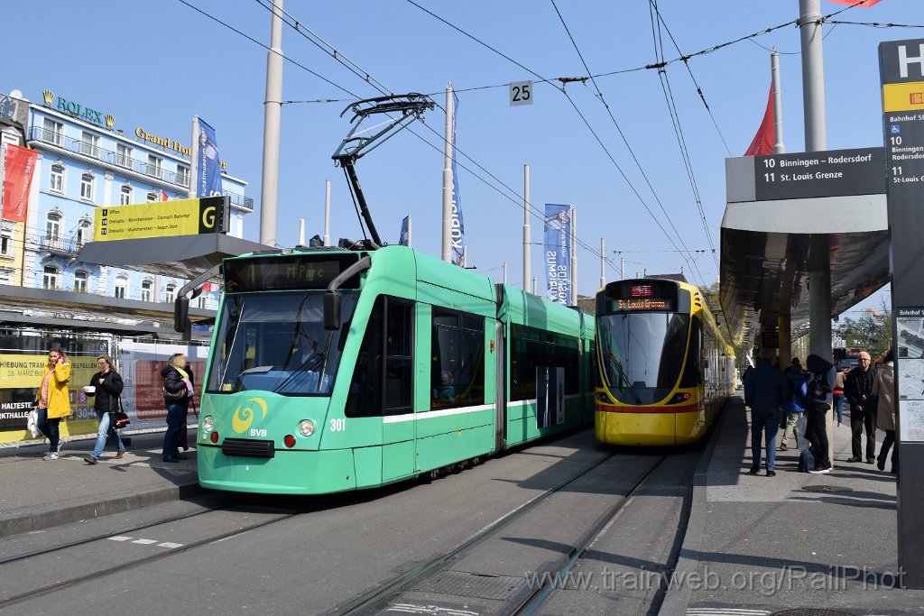 5389-0025-120419.jpg - BVB Be 6/8 301 + BLT Be 6/10 158 "Münchenstein" / Centralbahnplatz 12.4.2019