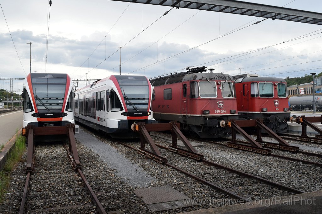| SBB-CFF RABe 520.009 "Schloss Heidegg" + RABe 520.006 "Hitzkirch" + Re 6/6 11629 (Re 620.029-9) "Interlaken" + Re 4/4" 11148 (Re 420.148-9) / Bülach 27.7.2019 | |
