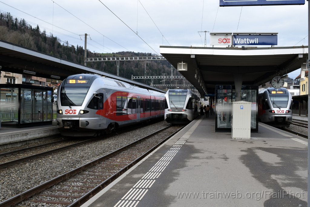 | SOB RABe 526.054-2 "Hoher Kasten" + Thurbo RABe 526.755-4 "Rheinfall" + SOB RABe 526.059-1 "St.Anton" / Wattwil 15.12.2019 | |