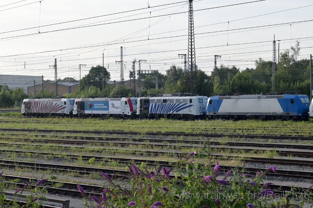 | Lokomotion 185.666-5 + 185.665-7 "50 Jahre Kombiverkehr" + 139.555-7 + ATLU 185.526-1 / München-Berg am Laim 13.8.2021 | |