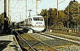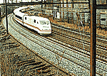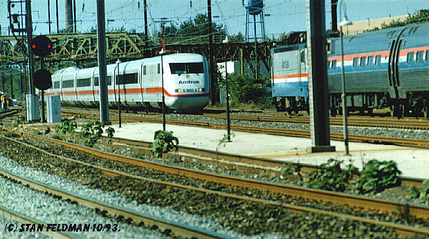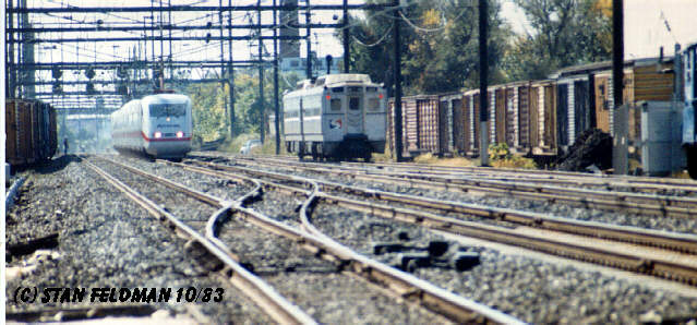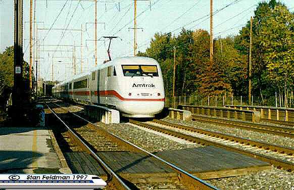 Click here to see The German Amtrak ICE Train on the curve at Frankford Jct., Phila. Pa. It is running north as Metroliner # 112. This is the same type of train that was involved in the deadly crash on 6/3/98 in Germany. Amtrak had no problems while testing this train. 9/93.