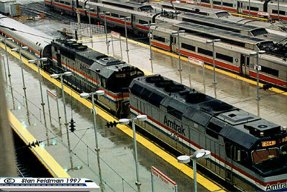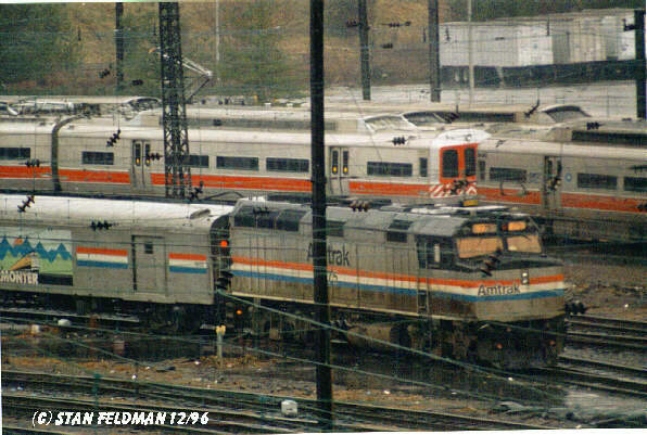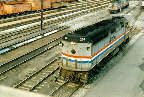 Click here to see a very dirty, Amtrak F-40-PH #275 (built by EMD in 1977), pulling into a rainy New Haven Conn. 12/96