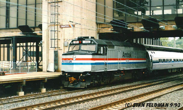 Click here to see Amtrak F-40-PHR #373 (built by EMD in 1978) with a Special Train bound for Atlantic City, in the Trenton N.J. Station. 9/23/93.
