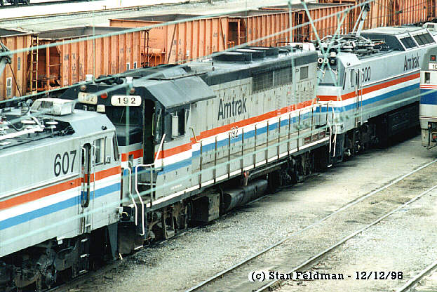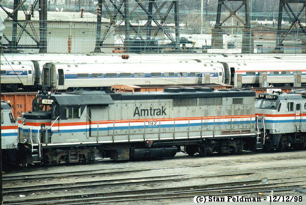 Click here for a front view of Amtrak GP-40-PH #192, built by EMD in 1966. It is sitting between 2 Amtrak E-60's, Race Street Terminal, Phila. Pa. 12/12/98.