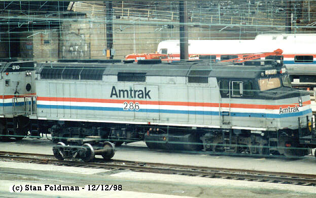 Click here to see Amtrak F-40-PHR #286, built by EMD in 1978. It is sitting between Amtrak #310 and several Roadrailers, at The Race Street Engine Terminal, Phila. Pa. 12/12/98.