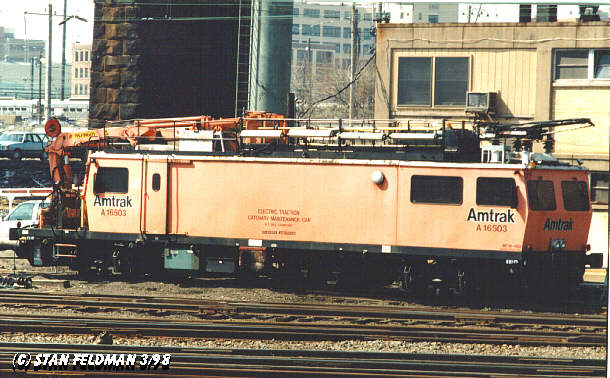 Click here to see The Amtrak Electric Traction Catenary Maintenance Car #A16503 parked at the entrance to Penn Coach Yard, 30th Street Station in Phila. Pa. 3/98