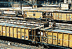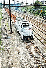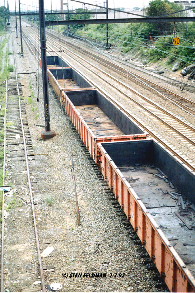 Click here for a top view of 4 empty Amtrak gondola cars at the rear of the train. This MOW train operates as a unit and is a little over 1/4 mile long , and is heading to Penn Coach Yard, Phila. Pa. 7/7/98.