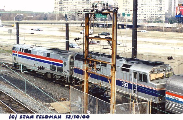 Click here to see Amtrak F40PHR #393, built by EMD and rated at 3000 HP, in Corridor Colors. It is with Amtrak P-42 #71 on a Silver Service Train at 30th Street Station, Phila Pa. 12/10/00.
