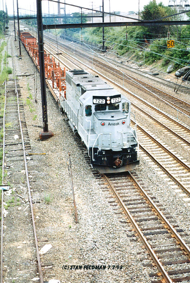 Click here to see Amtrak GP-38 #722 pulling a train of MOW Cars. The train has just passed Shore and is heading to Penn Coach Yard, Phila. Pa. 7/798.