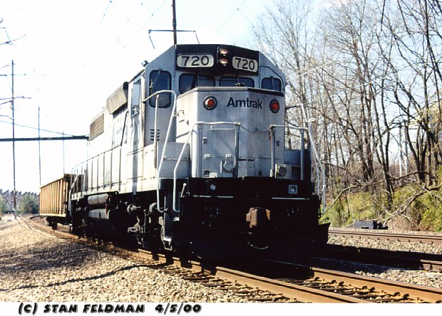 Click here to see Amtrak GP-38 #720, built by EMD in 1976 and rated at 2000 HP. It is running east (north) near Torresdale Station, Philadelphia Penna. 4/5/00.