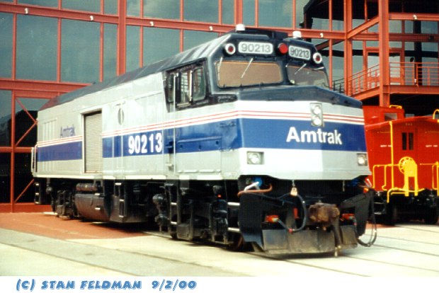 Click here to see Amtrak Non Powered Control unit #90213. This "cabbage"(Cab-Baggage) unit, built from an Amtrak F-40, is on display at Rail Expo 2000. Steamtown National Historic Site, Scranton Penna. 9/2/00.