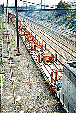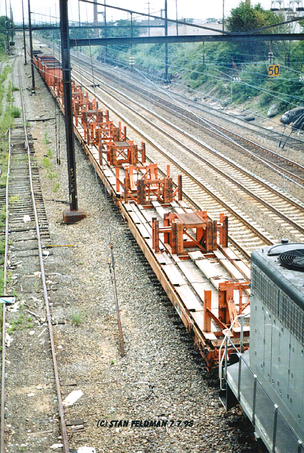 Click here to see empty Amtrak flatcars used to carry concrete ties. They are part of a MOW Train heading to Penn Coach Yard, Phila. Pa. 7/7/98.