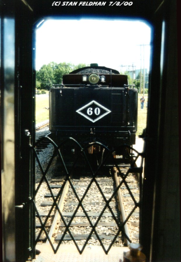 -Click here for a rear view of Black River and Western Railroad (BRW) 2-8-0 #60 (steam), at Flemington NJ. It has just run around its train, and will back down and couple for the trip back to Ringoes, New Jersey. 7/8/00.