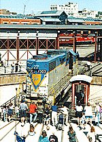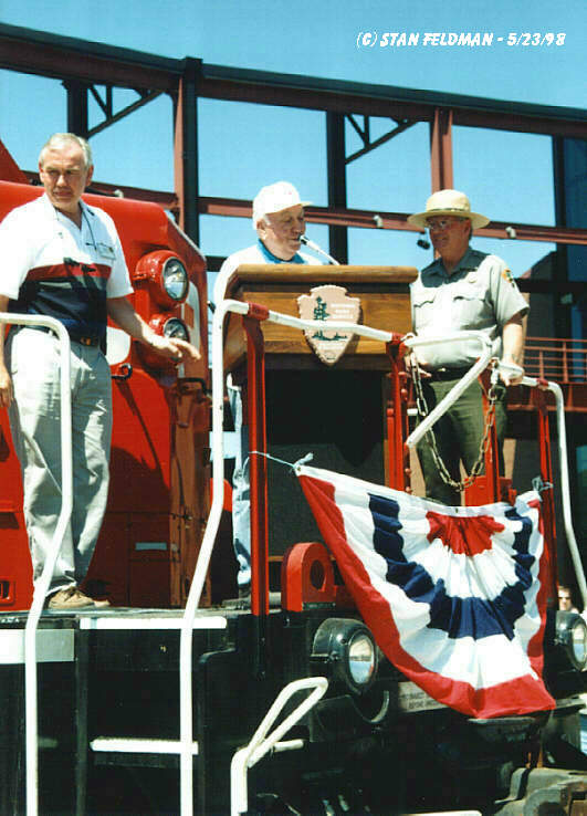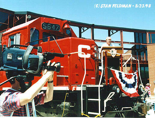 -Click here to see D+H President Paul Gilmore on the nose of CP SD-40-2 #5647. He is speaking to the crowd at Steamtown , which included many D+H employees, about the 175th Anniversary of The Delaware and Hudson Railway. The D+H is the oldest continuously operated transportation company in America. Steamtown National Historic Site, Scranton Pa. 5/23/98.