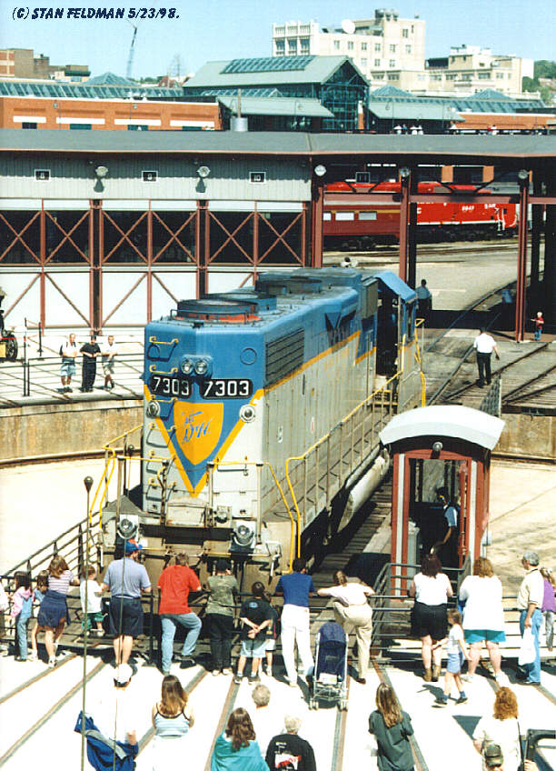 -Click here to see lightning striped, Delaware + Hudson GP-38-2 #7303, on the 90 foot Roundhouse Turntable at Steamtown National Historic Site, Scranton Pa. 5/23/98.