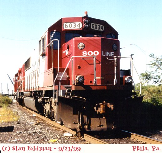 -Click here for a front view of Soo SD-60 #6034. It is parked with a dual-flags CP Rail unit at the Ameriport in Philadelphia Pa. 9/23/99.
