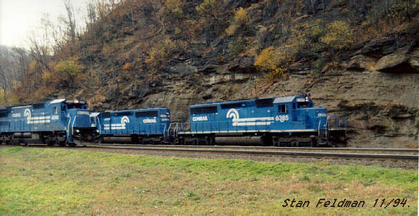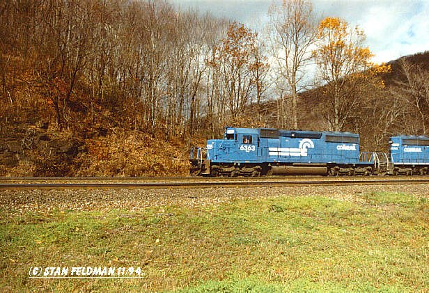 Click here to see Conrail SD-40-2 #6363 leading a long coal train into The Horseshoe Curve National Historic Landmark,in Altoona Pa. 11/94.