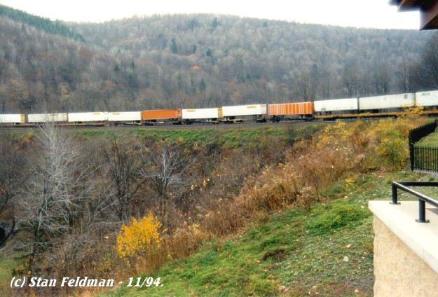 Click here to see a section of a Conrail TOFC Train stretching around The Horseshoe Curve National Historic Landmark, in The Allegheny Mountains. Altoona Pa. 11/94