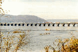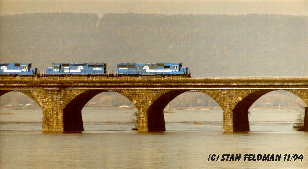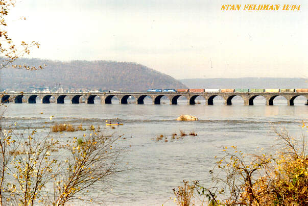 Click here to view a Conrail Train crossing the Rockville Bridge in Harrisburg Pa. , on an overcast day in 11/94. The Pennsylvania Railroad built the bridge across The Susquehanna River in 1902. The bridge is 3,280 feet long and is the longest stone-arch bridge in the world.