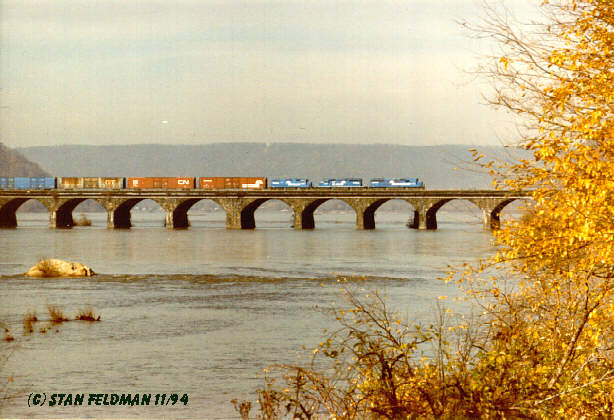 Click here for a wide view of 3 Conrail Engines leading a long train across the Rockville Bridge in Harrisburg Pa. 11/94