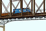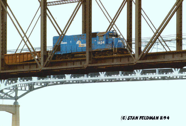 Click here to see Conrail GP-15-1 #1634 with a work train on the Delair Bridge, between Phila. Pa. and Delair N.J. The Betsy Ross Bridge is seen in the background. 8/94.