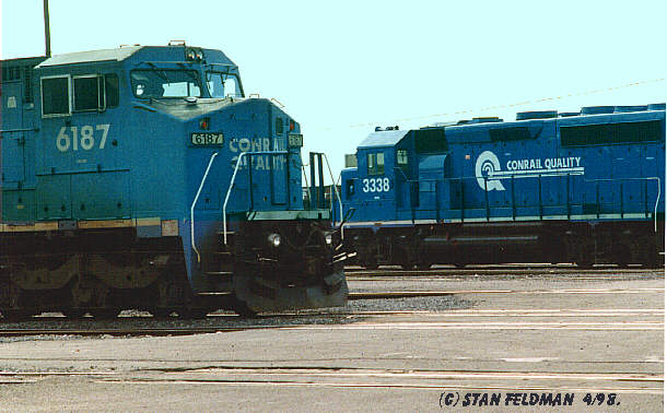 Click here to see a close front end view of Conrail C-40-8W #6187 sitting in the Conrail Greenwich Yard in Phila. Pa. Conrail GP-40-2 #3338 is passing in the background. 4/98.| Click here to Search Stan's RailPix ! |