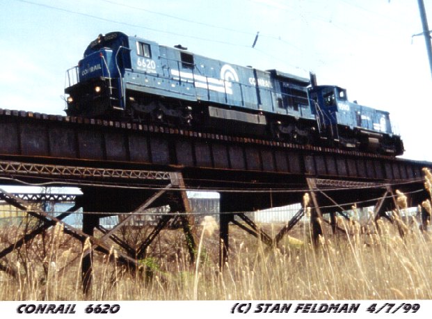 Click here to see Conrail "Ballast Express" C-36-7 #6620 , built by General Electric in 1985 and rated at 3600 HP. It is leading Conrail #9590 off the Delair Bridge and running to Greenwich Yard, Philadelphia Pa. as EXC-101. 4/7/99.