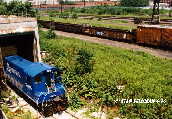 Click here to see Conrail SW1001 #9415 working along the Amtrak NEC south of Shore Tower, Phila. Pa. 6/96.