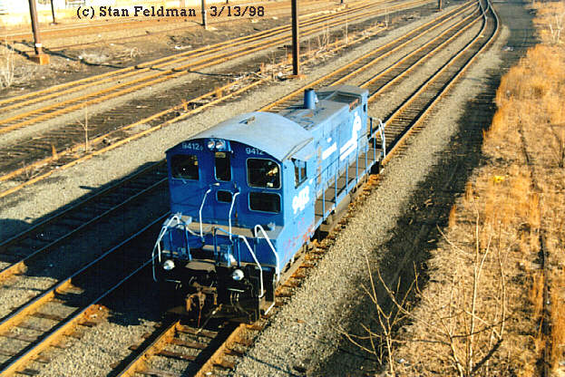 -Click here for a rear view of Conrail SW-1001 #9412 at work in the Frankford Junction Yard, Philadelphia Pa. This engine was built by EMD in 1973 and is rated at 1000 HP. 3/13/98.